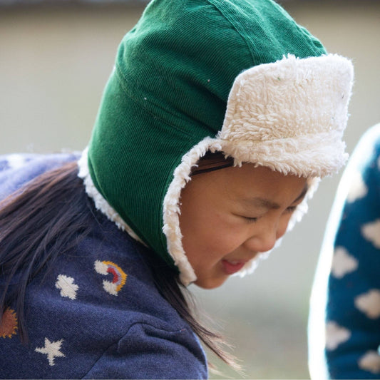 Vintermössa barn – Vintage Green, ekologisk sherpa & knäppbar hakrem | Little Green Radicals