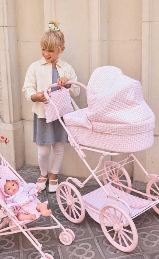 Dockvagn Rosa Vichy – vikbar barnvagn för dockor Monnëka
