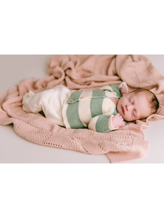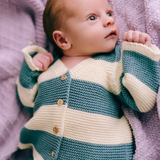 Nyfödd Cardigan Länkar Mint-Ecru - Ekologisk Bomull, Stickad Jacka med Olivträknappar