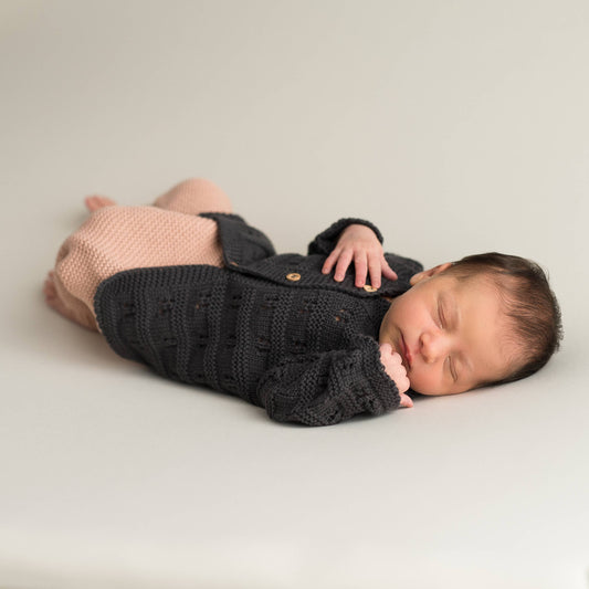Stickad nyföddkofta utan sömmar – mörkgrå bomull från Micu Micu, tillverkad i Spanien