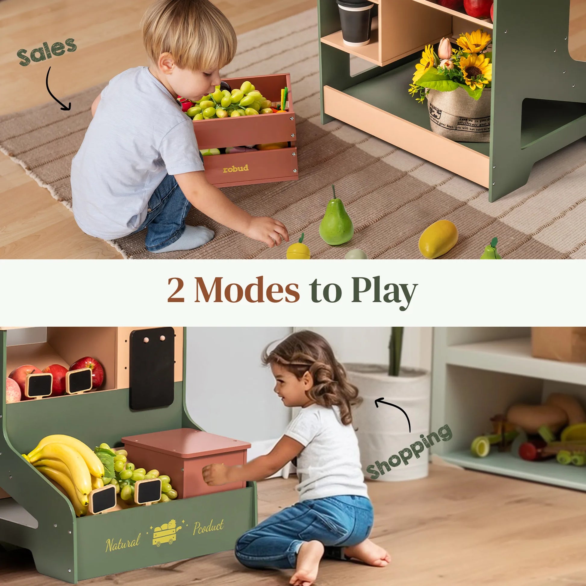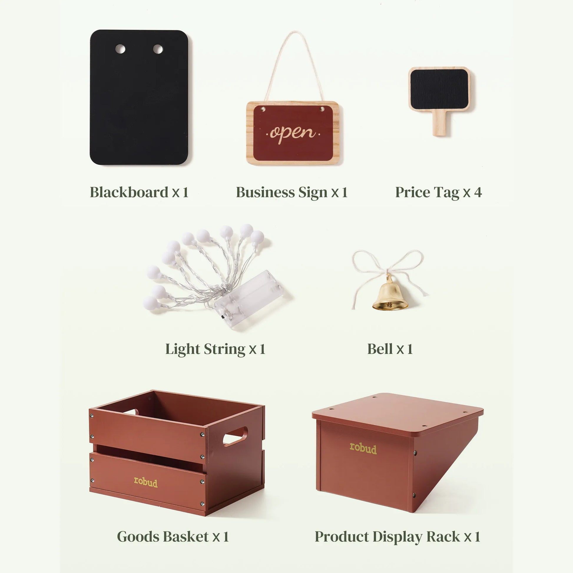 Den robusta träkonstruktionen och de barnvänliga, giftfria färgerna gör kiosken både hållbar och trygg. Den uppmuntrar barn att utveckla siffor & räkning, språk, fantasi och socialt samspel, samtidigt som den ger en trygg introduktion till vardagen.
