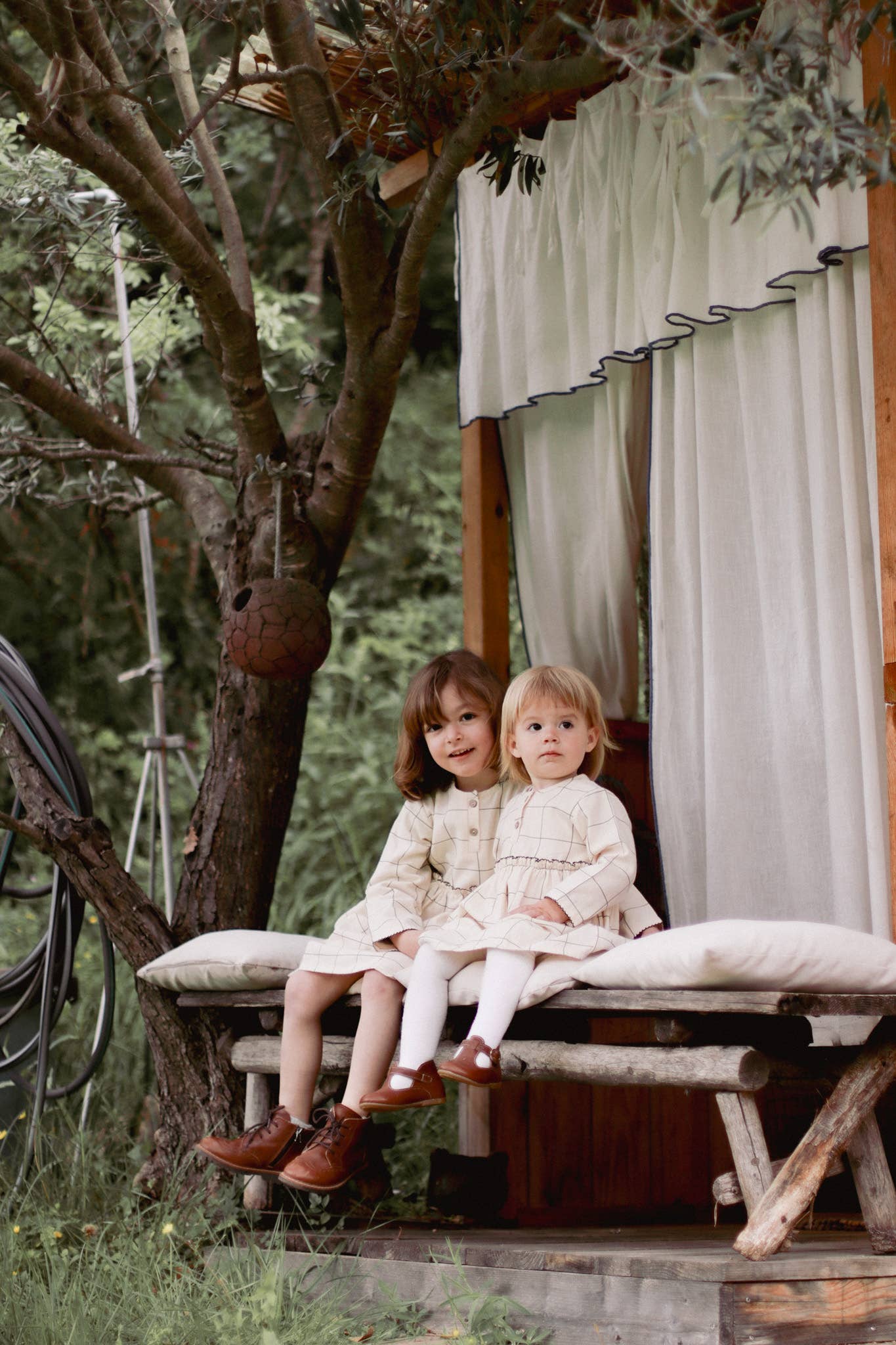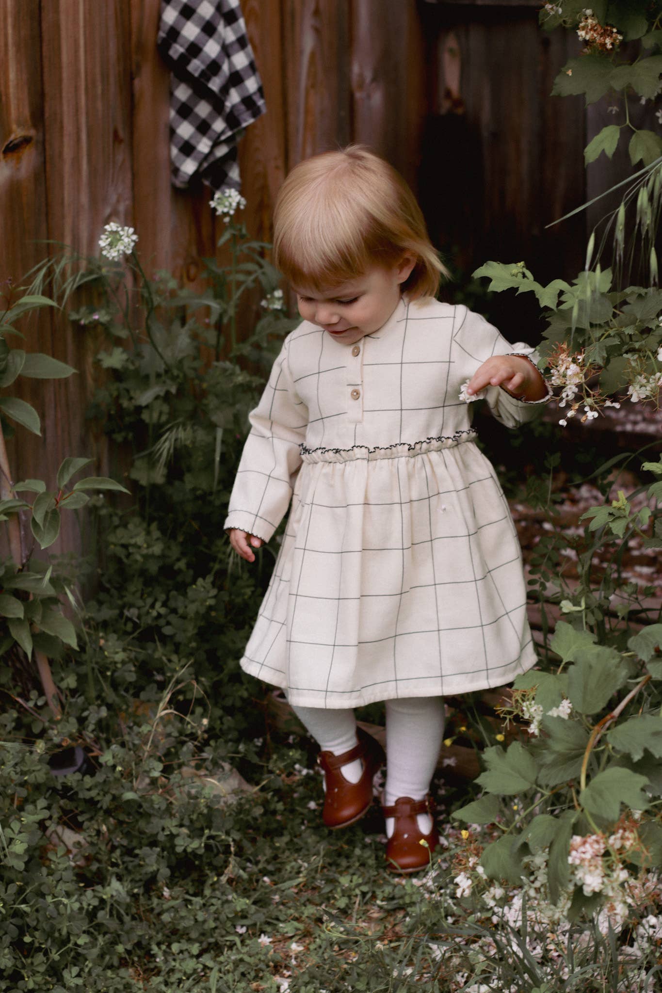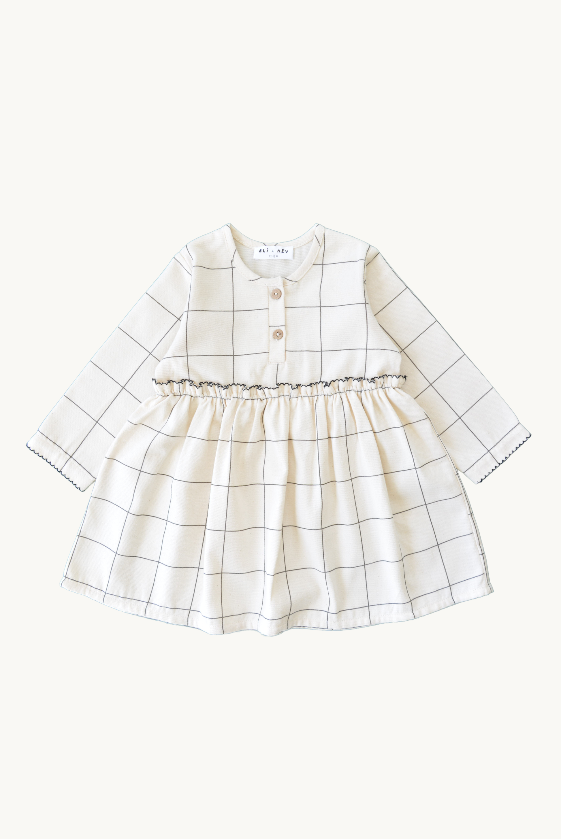 Sarah-klänningen från Eli & Nev är en vackert utformad baby- och flickklänning i ett mjukt, rutigt mönster i blekt svart på beige botten. En klassisk siluett med noggrant balanserade detaljer som ger plagget ett lugnt men uttrycksfullt helhetsintryck.