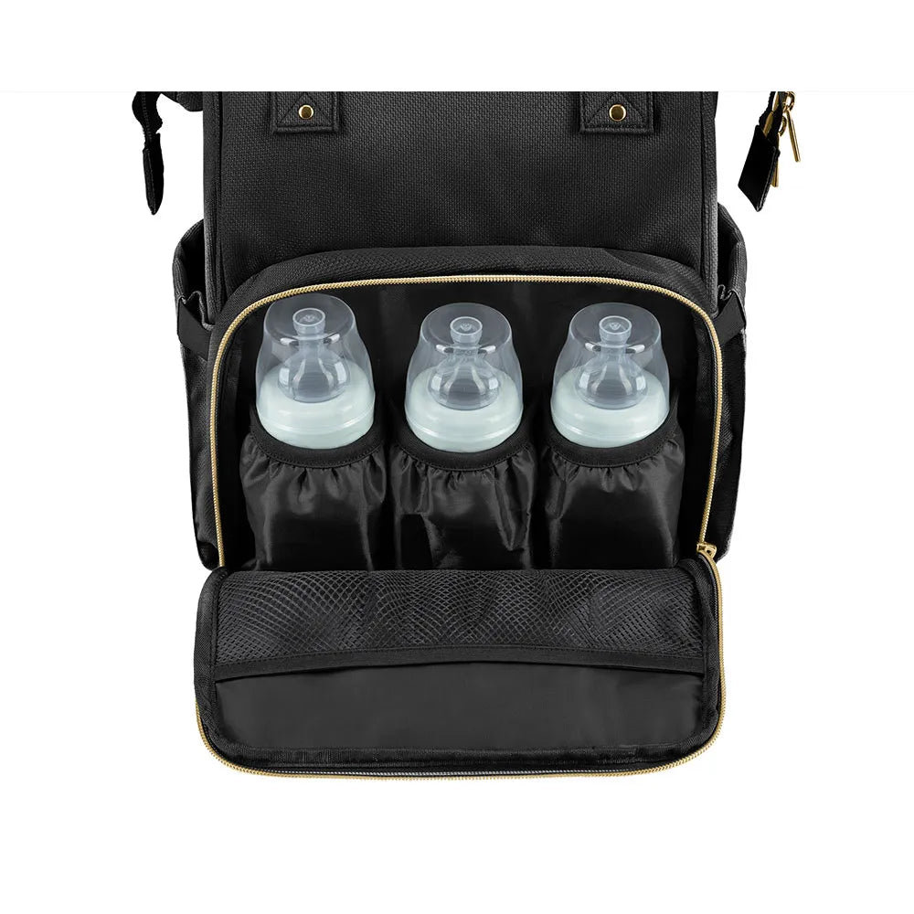 Skötväska ryggsäck svart – stor mamma-väska med isolerade fickor | Siena Black & Gold – Kikkaboo