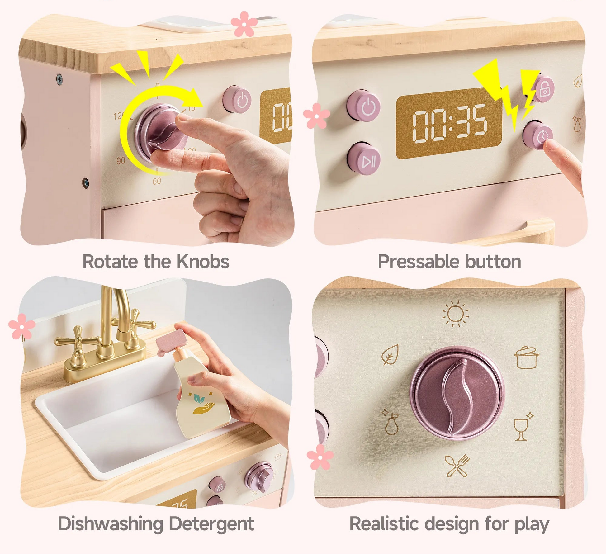 Det här kompakta barnköket är byggt i robust trä och har realistiska detaljer som vridbara knappar, öppningsbar ugnslucka, diskho och hylla för förvaring. Allt i en mjuk rosa design som både barn och föräldrar älskar.