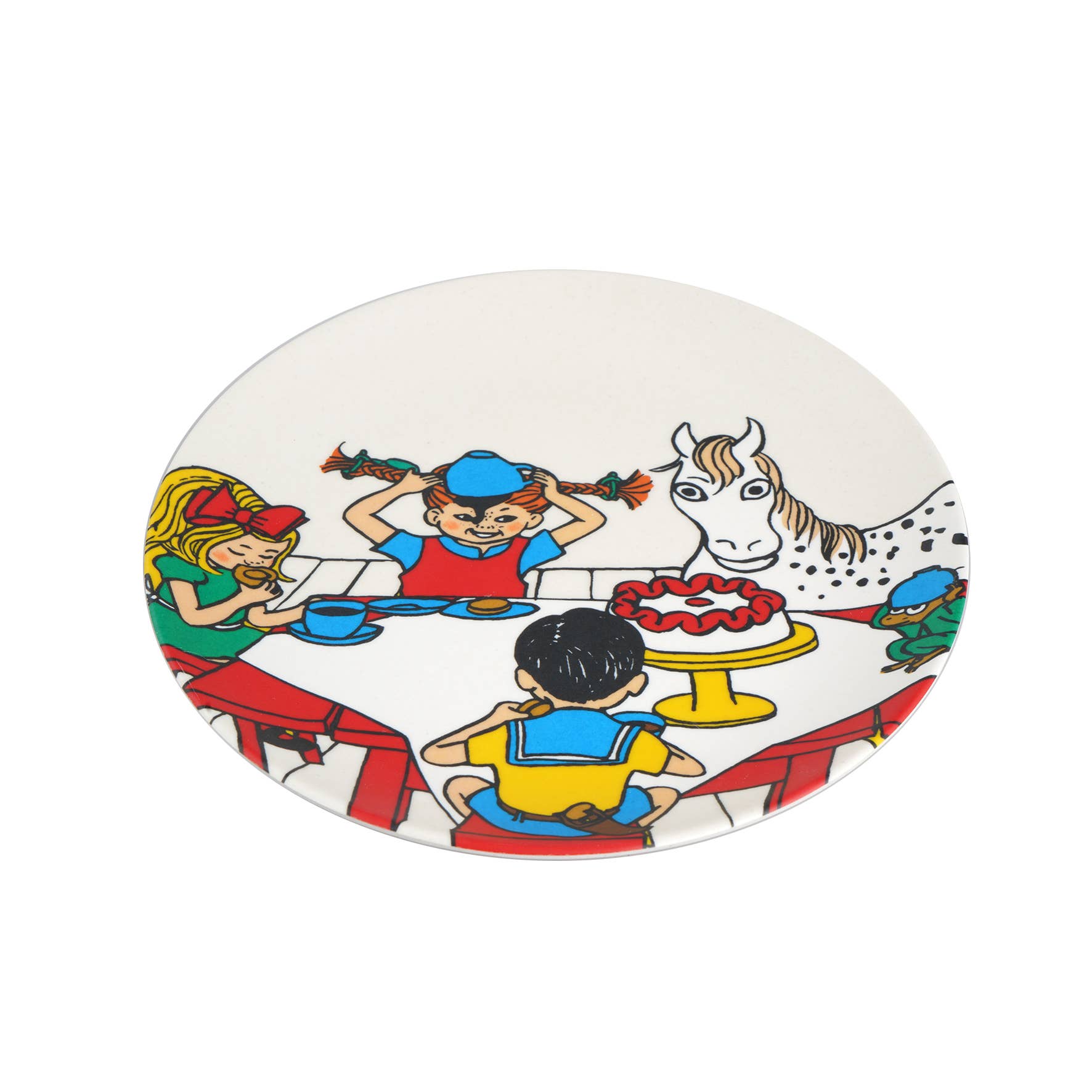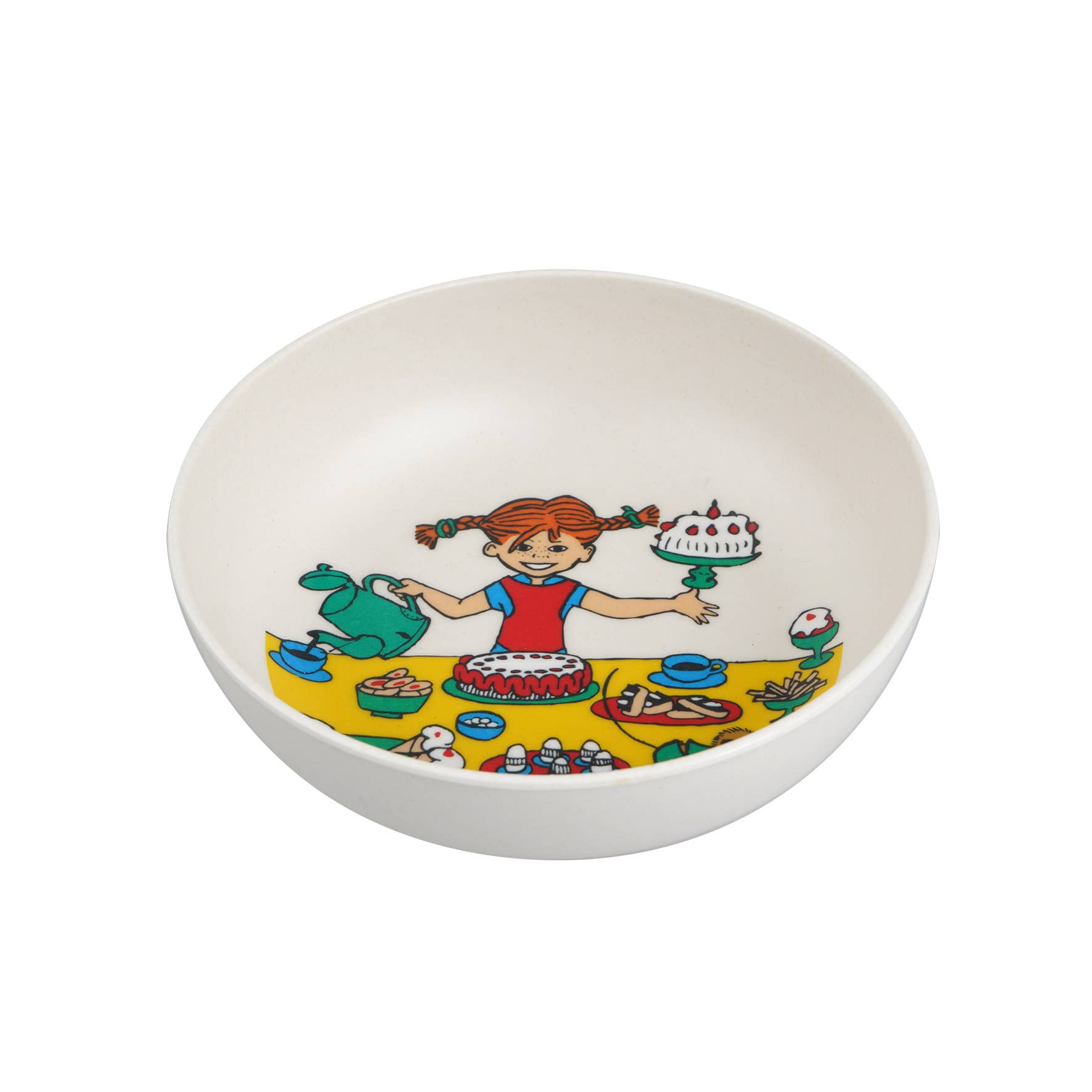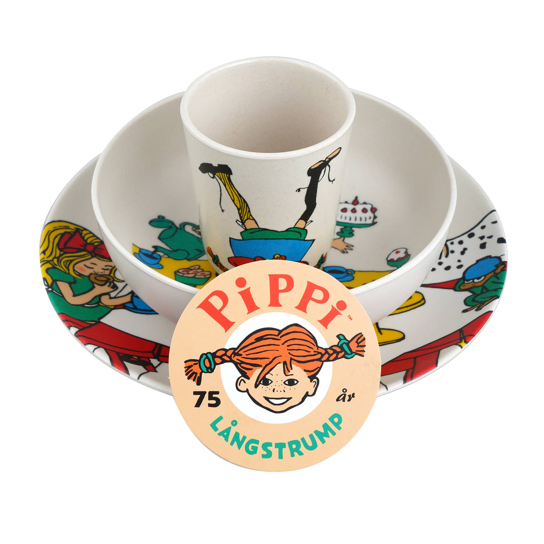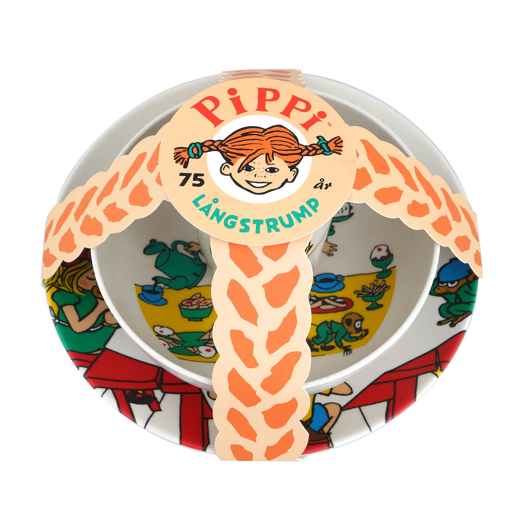 Färgglad barnservis i 100 % melamin med klassiska Pippi-motiv – perfekt när det är dags att börja äta själv. Tål diskmaskin, ej mikro. Levereras i presentask; en fin gåva till dop, namngivning och födelsedag.