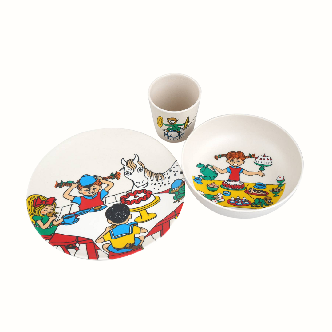 Pippi Långstrump barnservis i melamin – 3 delar (tallrik, skål, mugg)