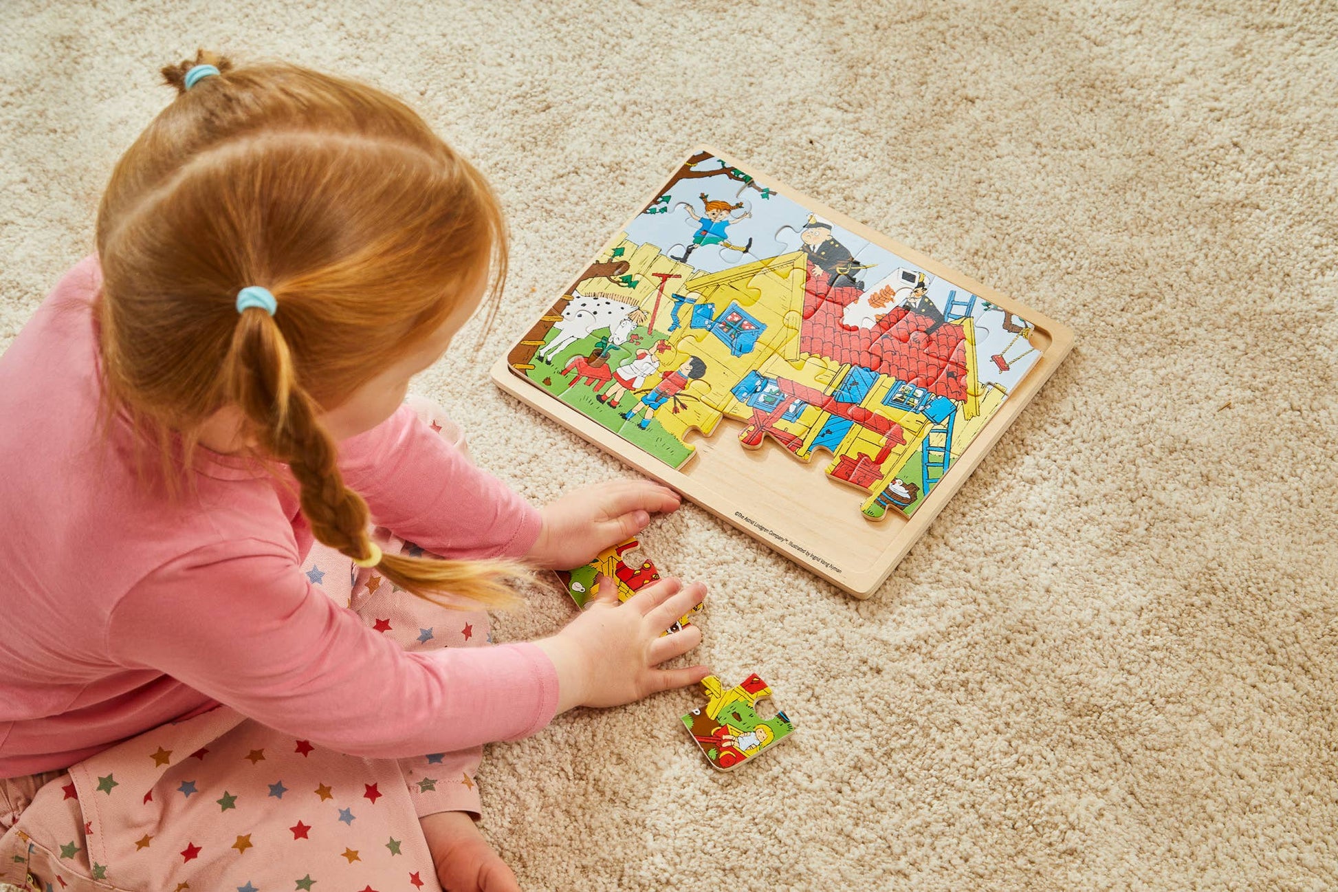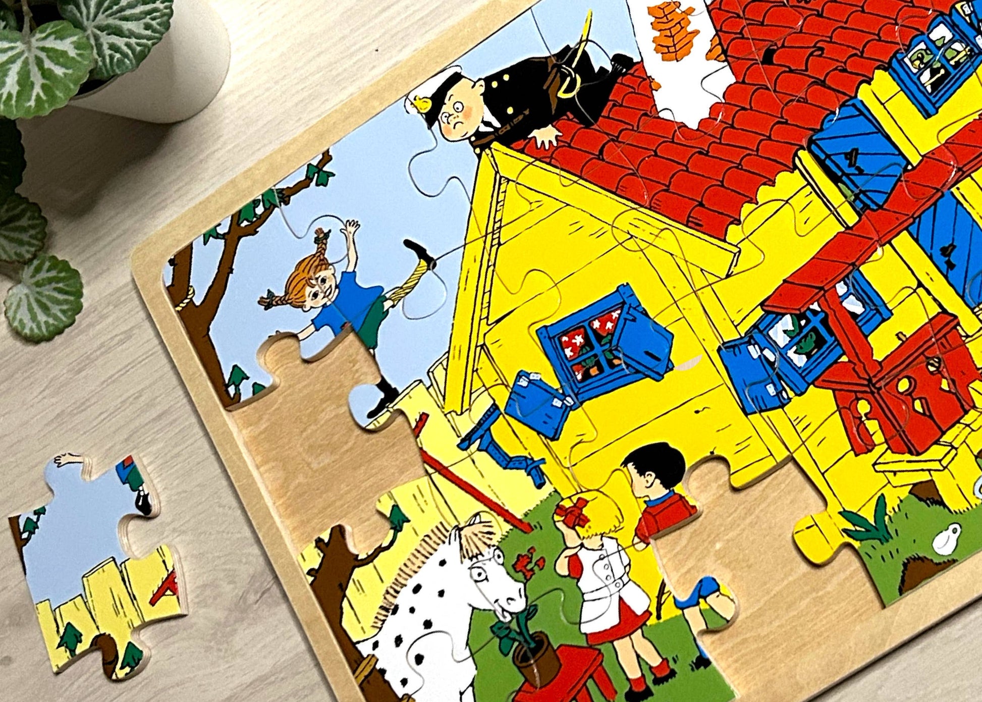 Klassiskt träramspussel med älskat Pippi Långstrump-motiv. Tillverkat i FSC-certifierat trä för ett hållbart val som tål många timmars lek. Från 3 år – tränar finmotorik och bildseende på ett lekfullt sätt.