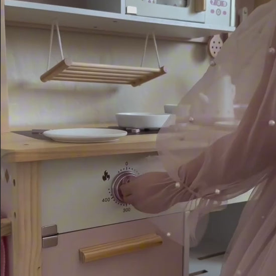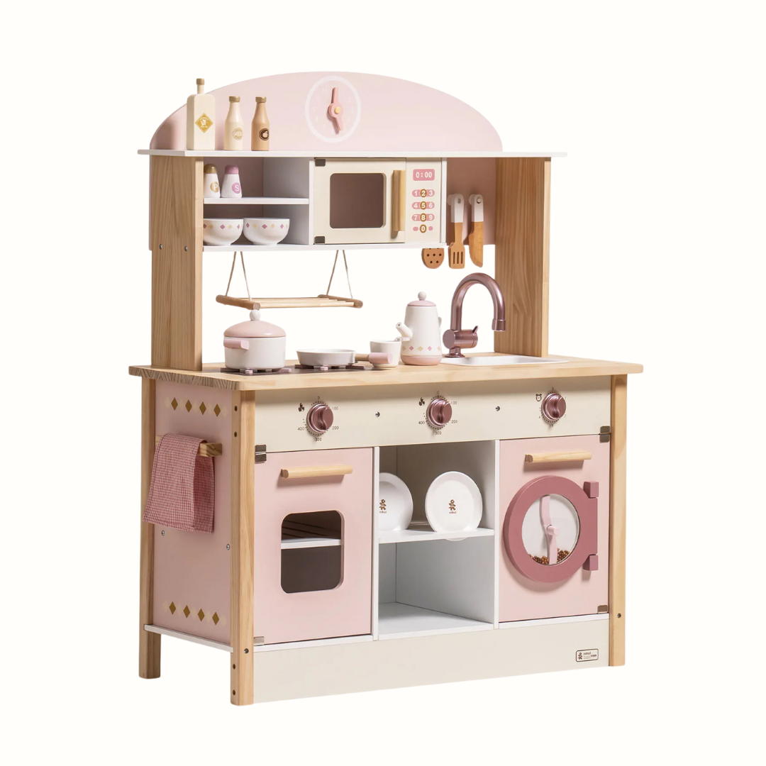 Allt ingår för att börja leka direkt – och tvätten rullar också! Ett rosa träleksakskök med spis, ugn, diskho, tvättmaskin och smart förvaring, plus realistiska tillbehör (kastrull, stekpanna, redskap m.m.). Robust nog för vardagslek, vackert nog för barnrummet.