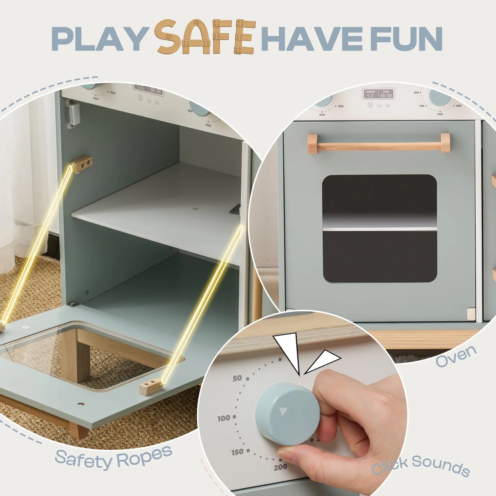 Ett minimalistiskt barnkök i trä i dov blå nordisk stil – med öppningsbar ugn, vridbara vred, diskho/kran och hyllor för tillbehör. Designat för självständig, Montessori-inspirerad lek som tränar finmotorik, språk och ordning.