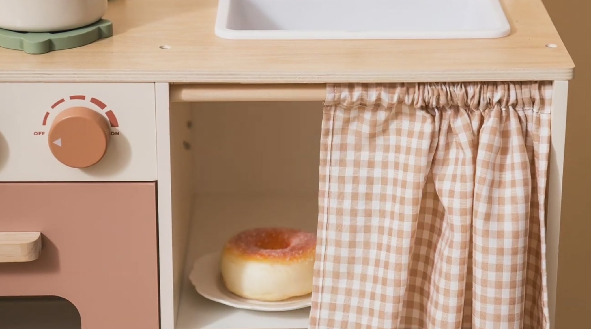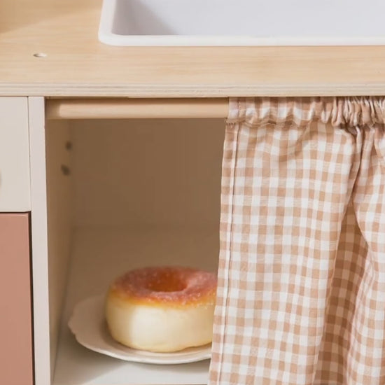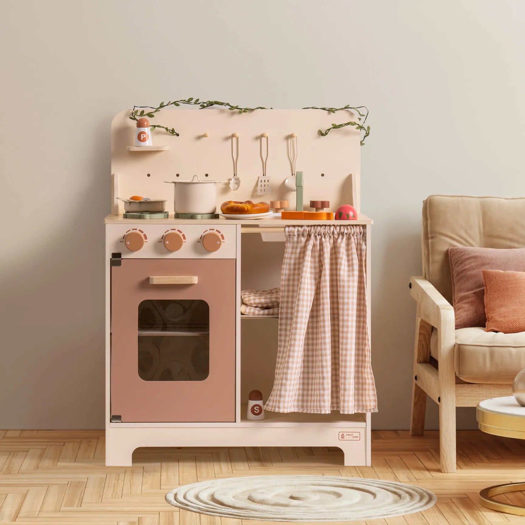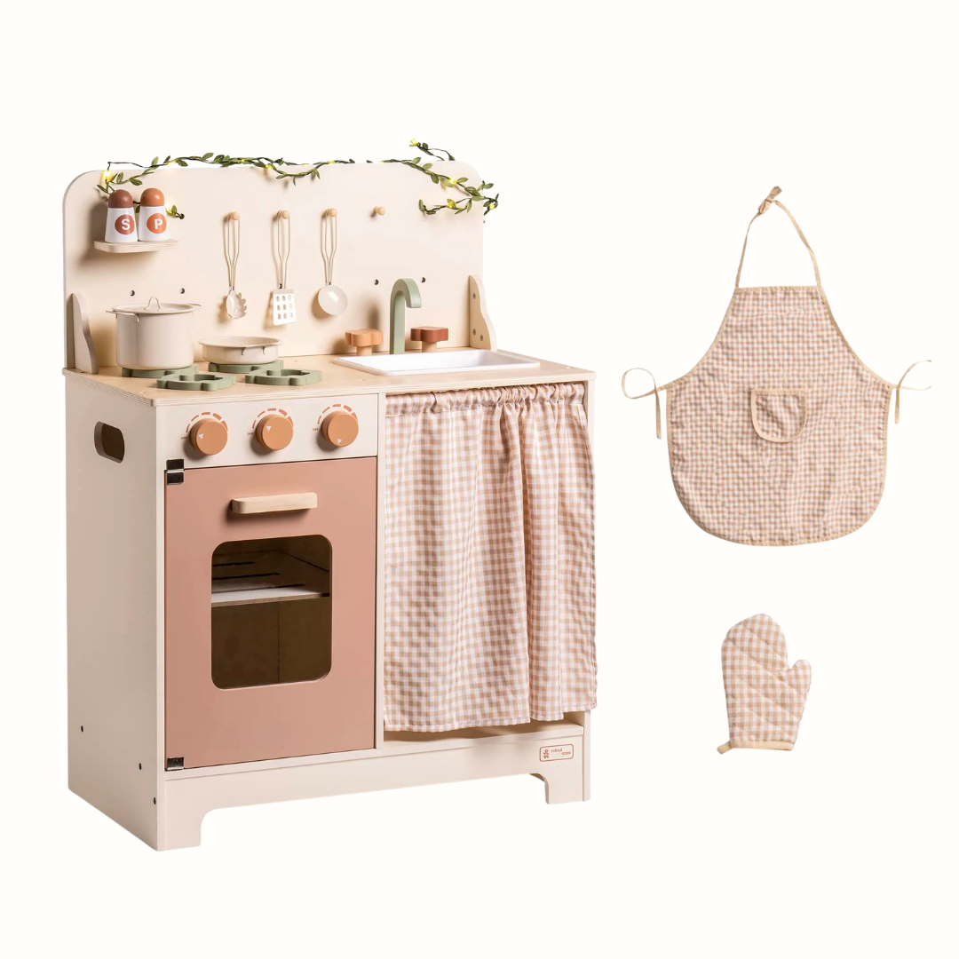 Allt ingår för att börja leka direkt. Det rustika träleksaksköket med bladformad ljusslinga kommer med tillbehör inkluderade – så fort du monterat är det bara att börja laga “mat”. Rattar som klickar, öppningsbara luckor och smart förvaring gör leken realistisk och rolig.