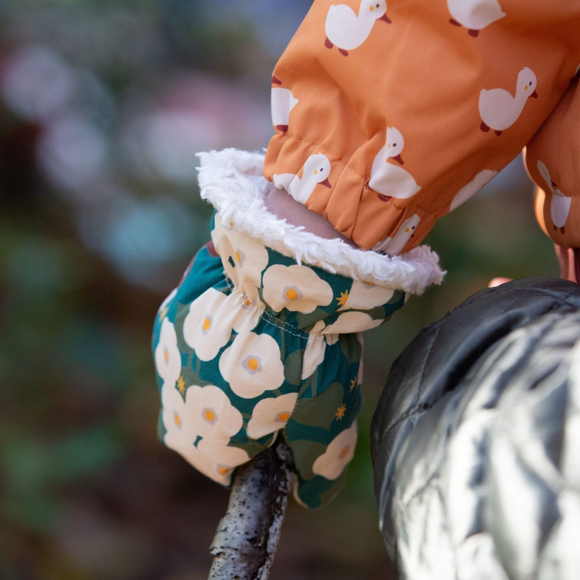 Vantarna är helfodrade med 100% ekologisk och oblekt sherpa-bomull, vilket gör dem både varma och andningsbara, så att barnet är bekvämt utan att bli svettigt. Den slitstarka poplin-ytan gör vantarna hållbara nog för vardagsanvändning, samtidigt som den mjuka passformen runt handlederna håller vantarna säkert på plats och bevarar värmen.