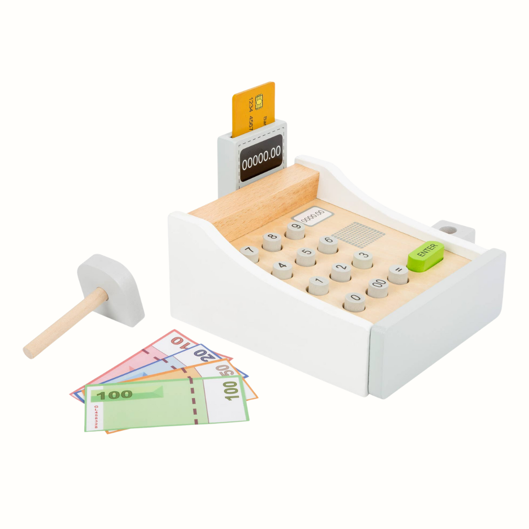 Låt barnen ta rollen som butiksägare med denna vackra leksakskassa i trä från small foot – ett charmigt och hållbart tillskott till varje liten affär.
