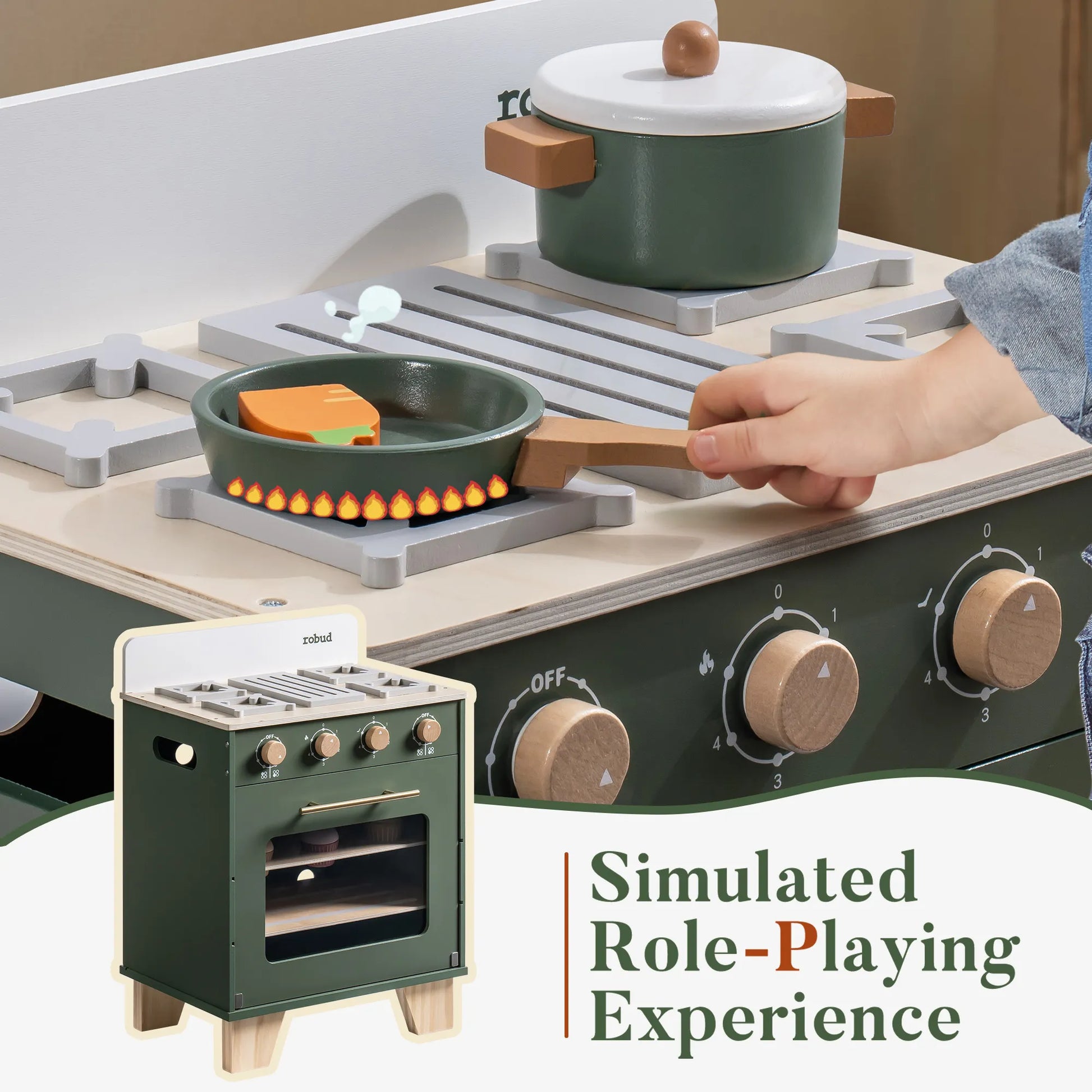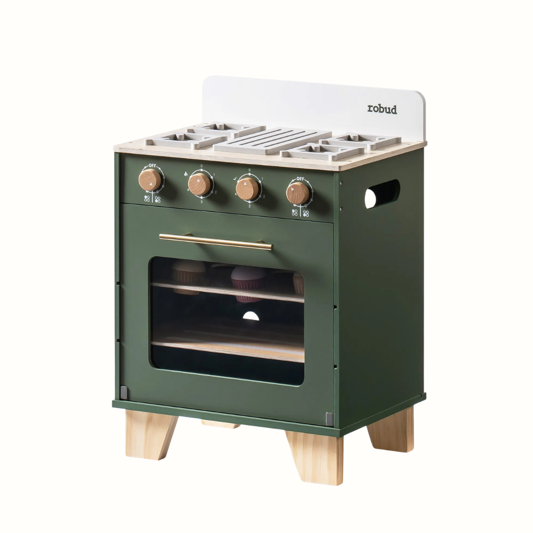 Leksaksugn i trä – Vintage Green (3+) | barnspis med spishäll & tillbehör