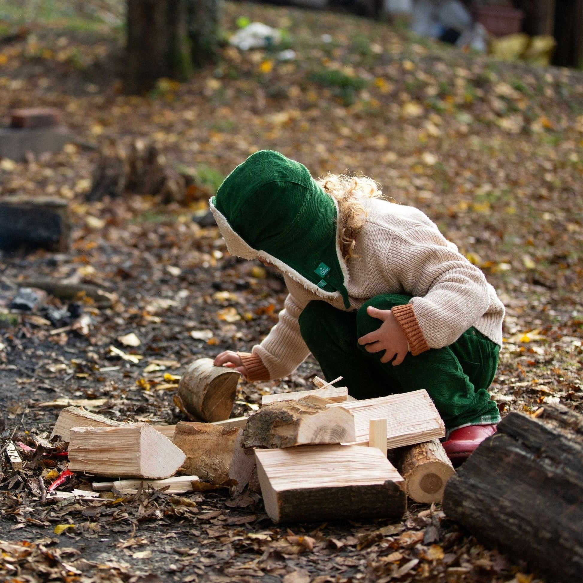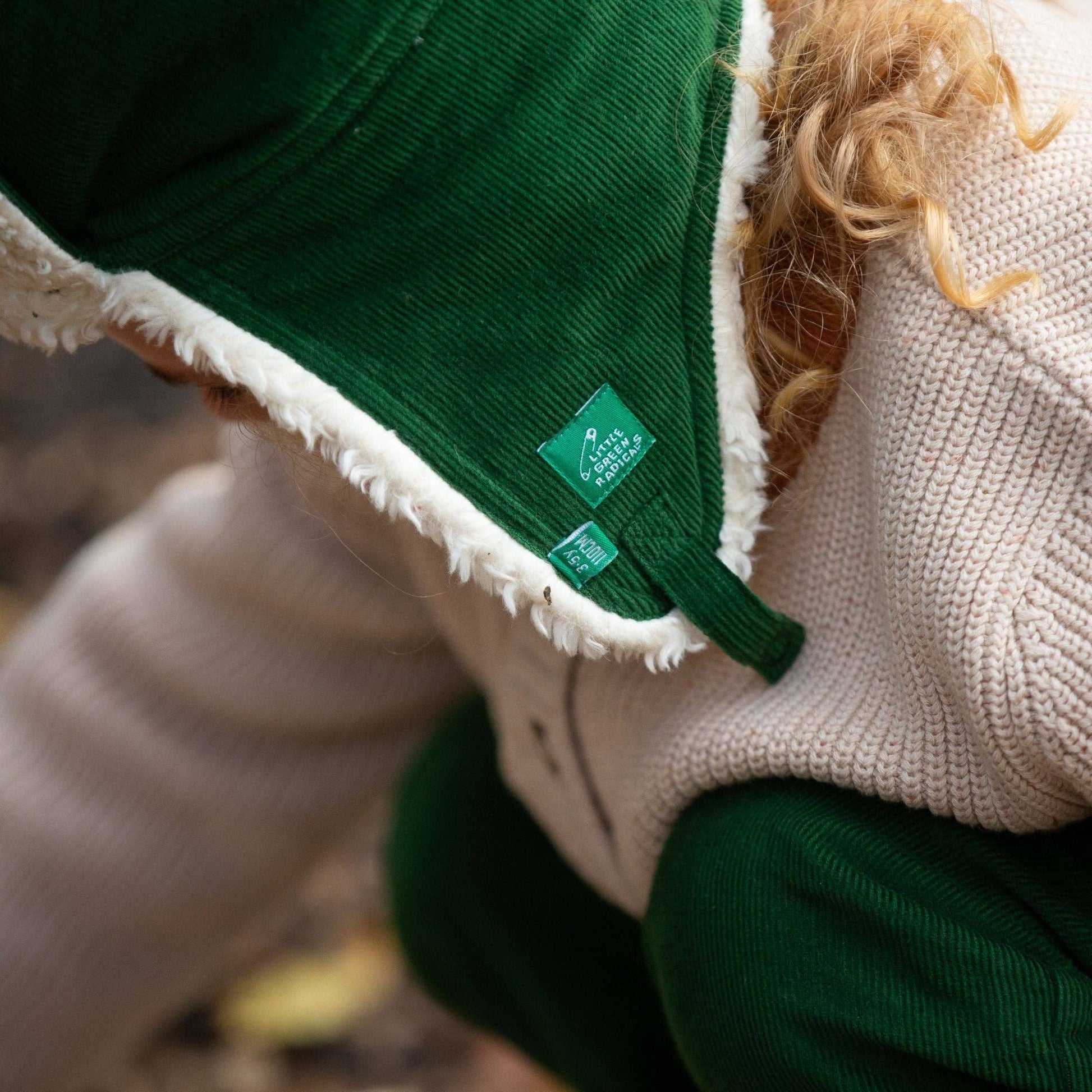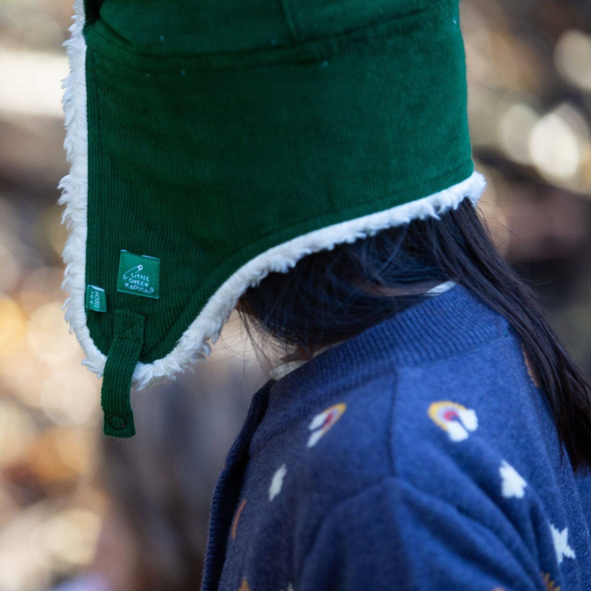 Vintermössa barn – Vintage Green, ekologisk sherpa & knäppbar hakrem | Little Green Radicals