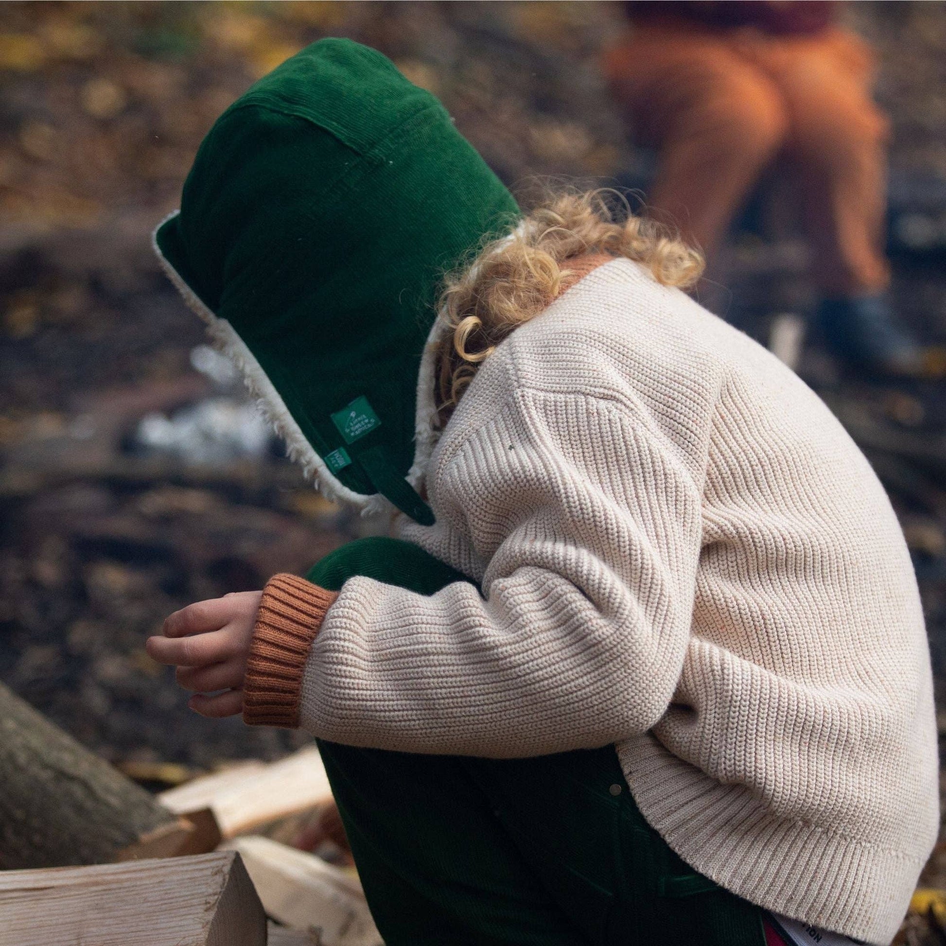 Mjuk värme som sitter kvar. Vintage Green Sherpa Fleece Cosy Hat är en helt fodrad vintermössa i 100% ekologisk & Fairtrade-bomull med andande, oblekt sherpa. Justerbar hakrem med tryckknapp, öronlappar och extra längd bak håller kylan ute – perfekt för lek i rusk och ridt.