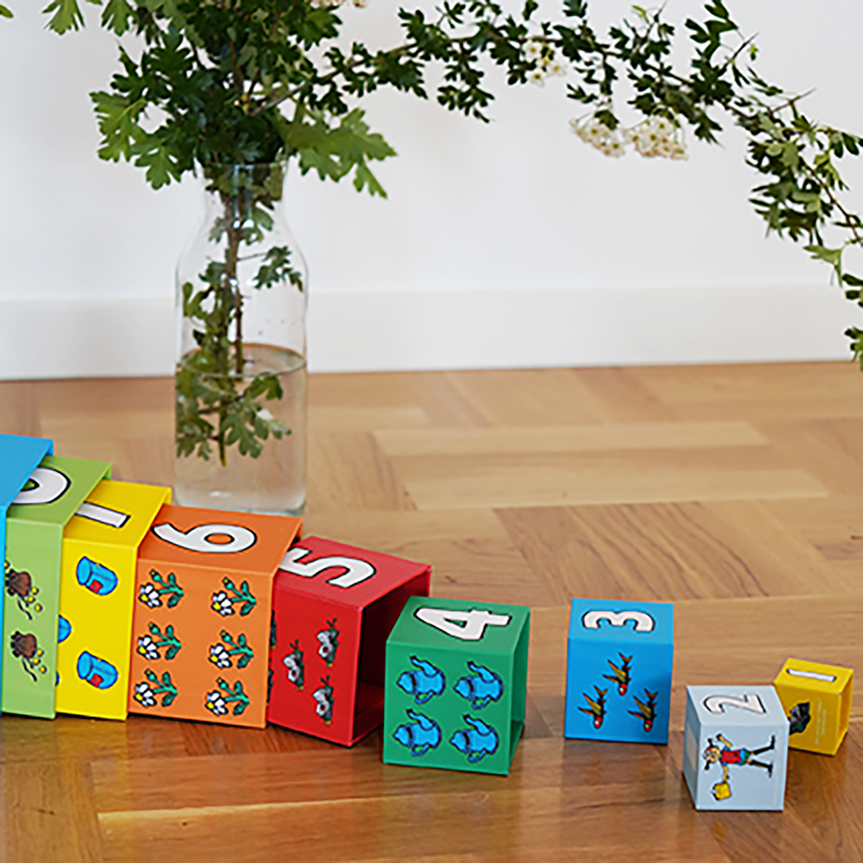 Varje kub är dekorerad med siffror och charmiga Pippi-motiv, vilket gör setet perfekt som första introduktion till färger, former och enkel matematik. Kuberna kan staplas, sorteras eller användas som små hus i fantasifull lek.