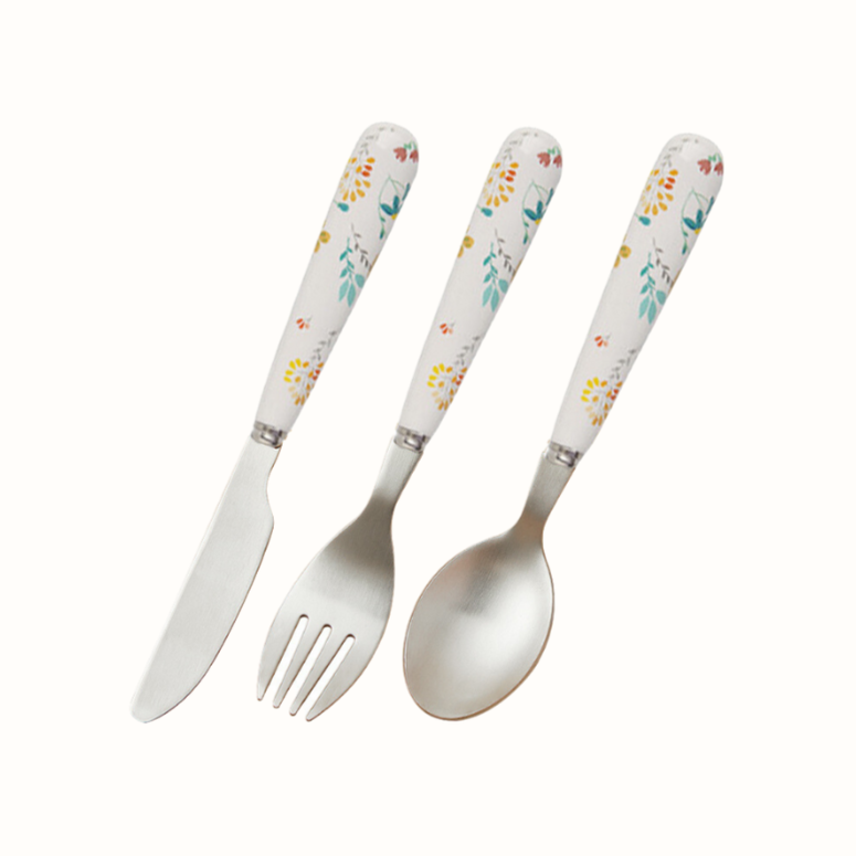 Detta bestickset är perfekt för att introducera ditt barn till att äta självständigt! Setet innehåller en kniv, en gaffel och en sked, alla tillverkade i hållbart rostfritt stål.