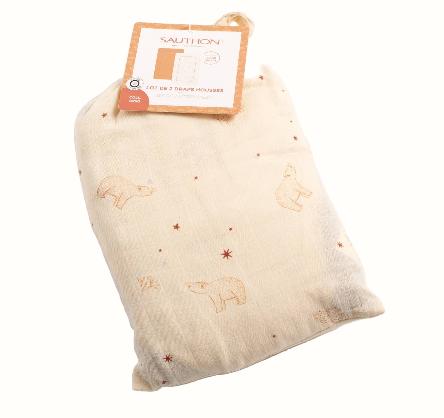 Ge mjuka och svala nätter med Sauthon ORSINO dra-på-lakan i ekologisk bomullsmuslin. Setet innehåller 2 lakan i andningsbar, len muslin som transporterar bort fukt när små barn svettas i sömnen. Lakanen är färg- och formsatta för att matcha ORSINO-temat och ger en harmonisk bäddning i spjälsängen. Den elastiska kanten ger en slät passform som ligger på plats hela natten och gör bäddningen enkel i vardagen.