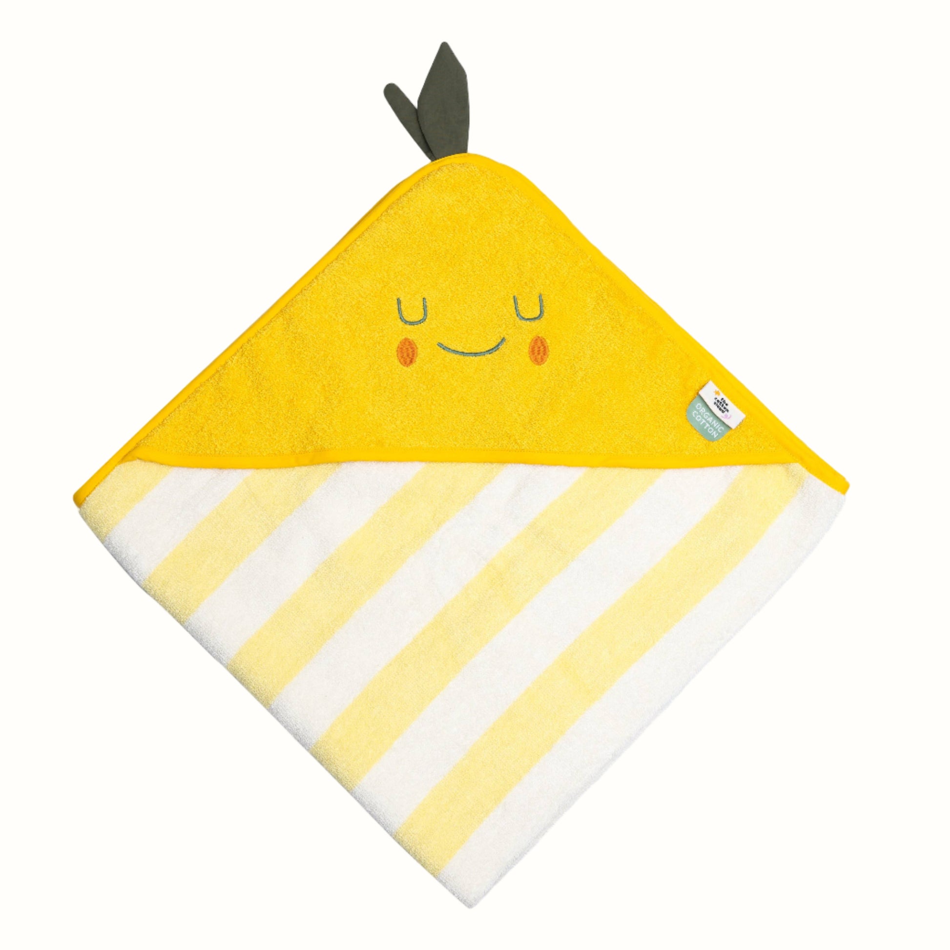Den söta citronhuvan gör torkningen till ett lekfullt äventyr, och den praktiska storleken 75 × 75 cm passar perfekt för både bebisar och småbarn. En solig favorit som sprider glädje efter varje bad!