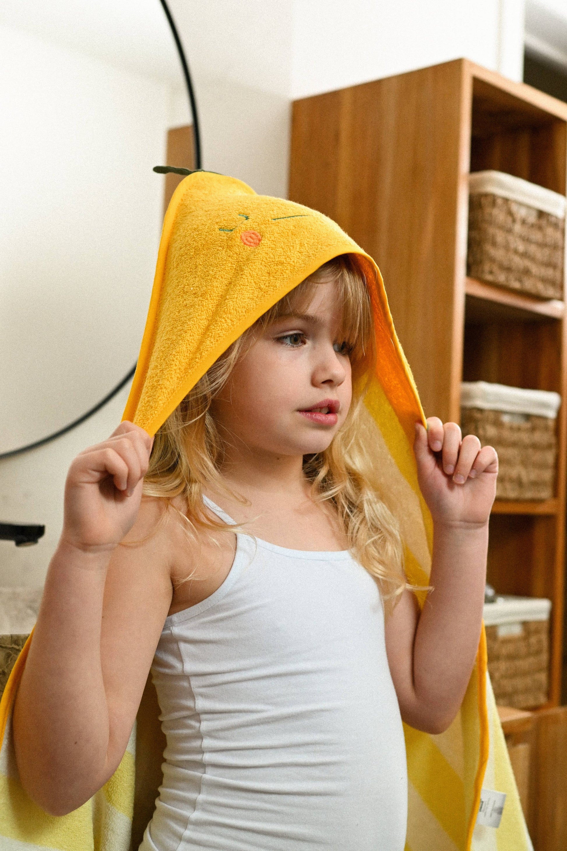 Gör badstunden extra rolig med Lola Lemon, en gul kapuhandduk i ekologisk bomull från The Cotton Cloud. Den är mjuk, gosig och framtagen för att hålla ditt barn varmt, torrt och bekvämt efter bad, simning eller strandlek.
