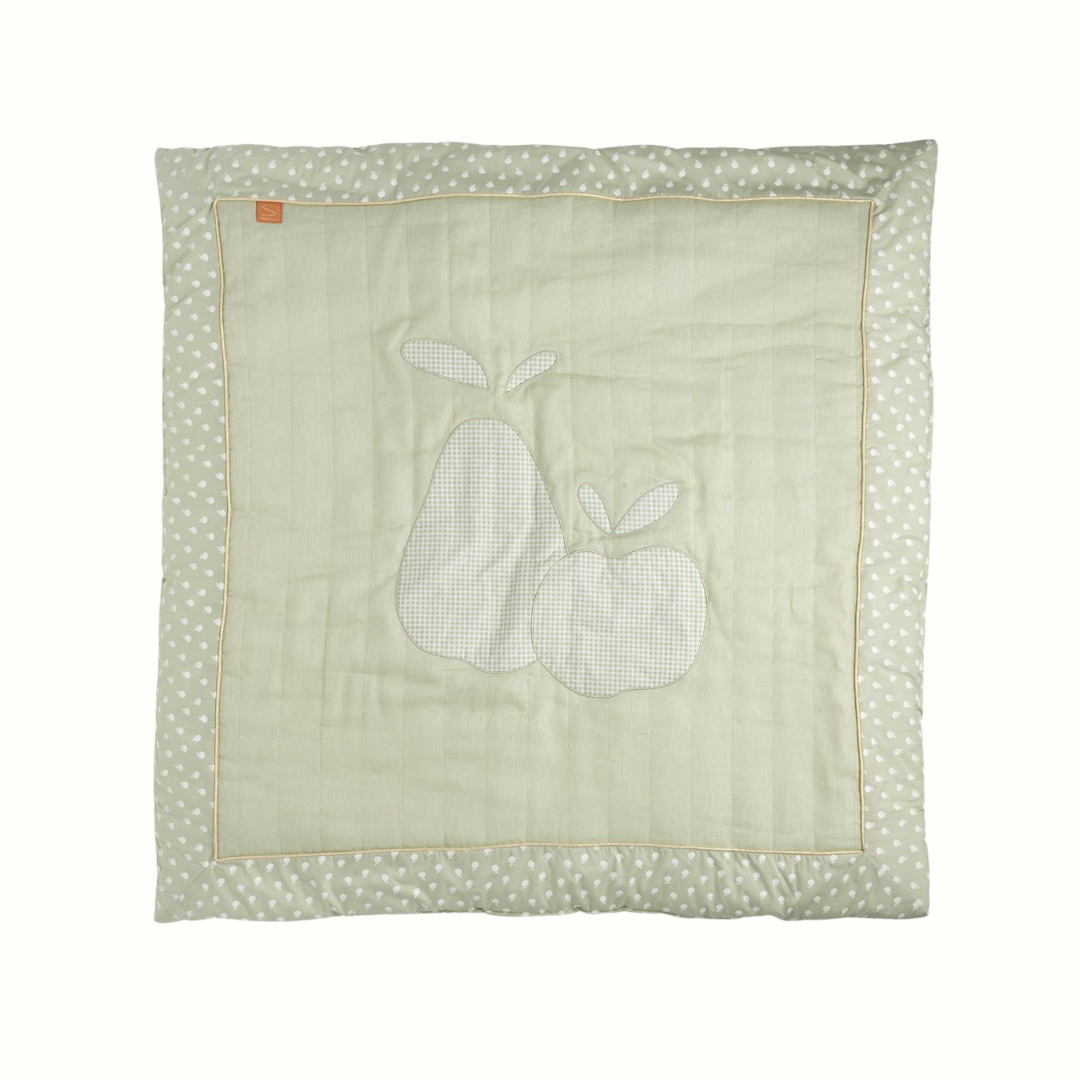 Mjukt vadderad lekmatta i linne/bomull som bjuder in till magläge, babygym och golvlek. Den botaniska designen ger en lugn, naturlig känsla i barnrummet – perfekt för att utforska sinnen och motorik i skön komfort.