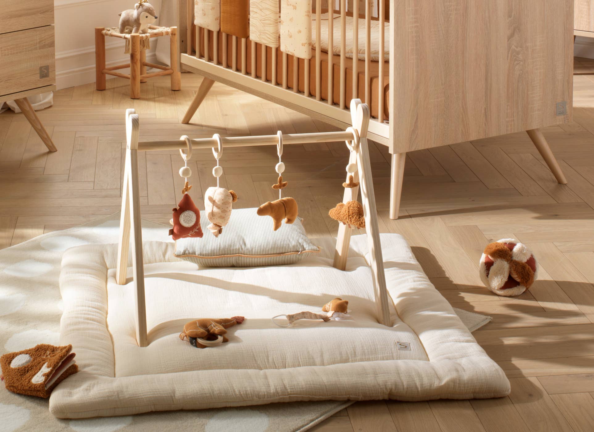 Mjukt vadderad, vändbar lekmatta i dubbel bomullsmuslin (double gauze) – skön för magträning, babygym och golvlek. Den lugna Vanilla-nyansen passar alla barnrum och ger total komfort när motoriken utvecklas.