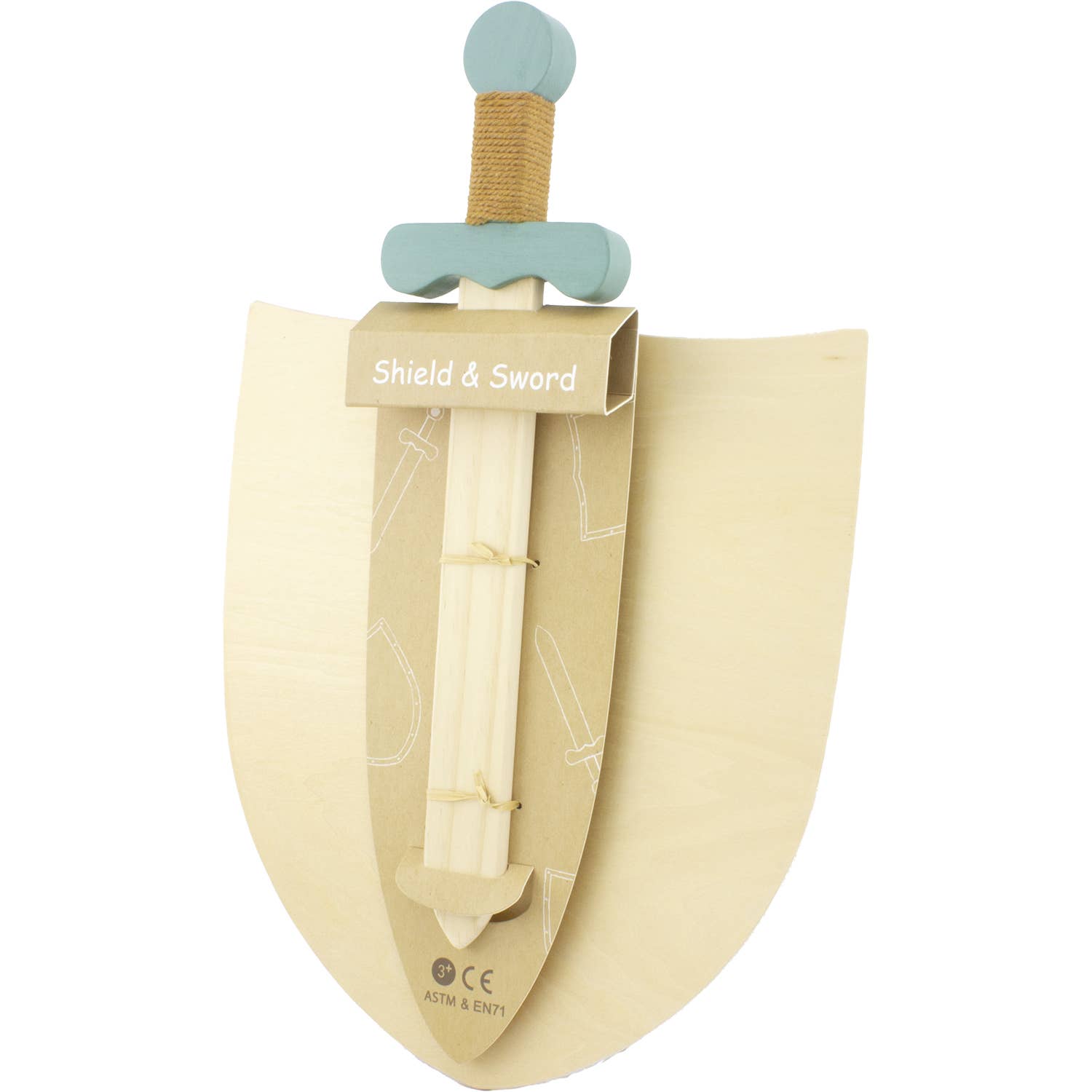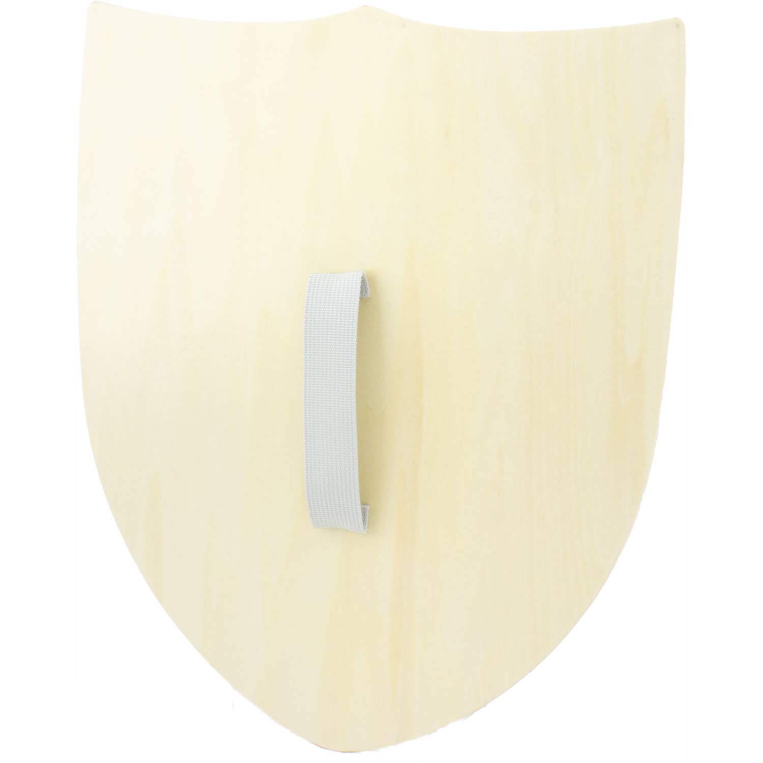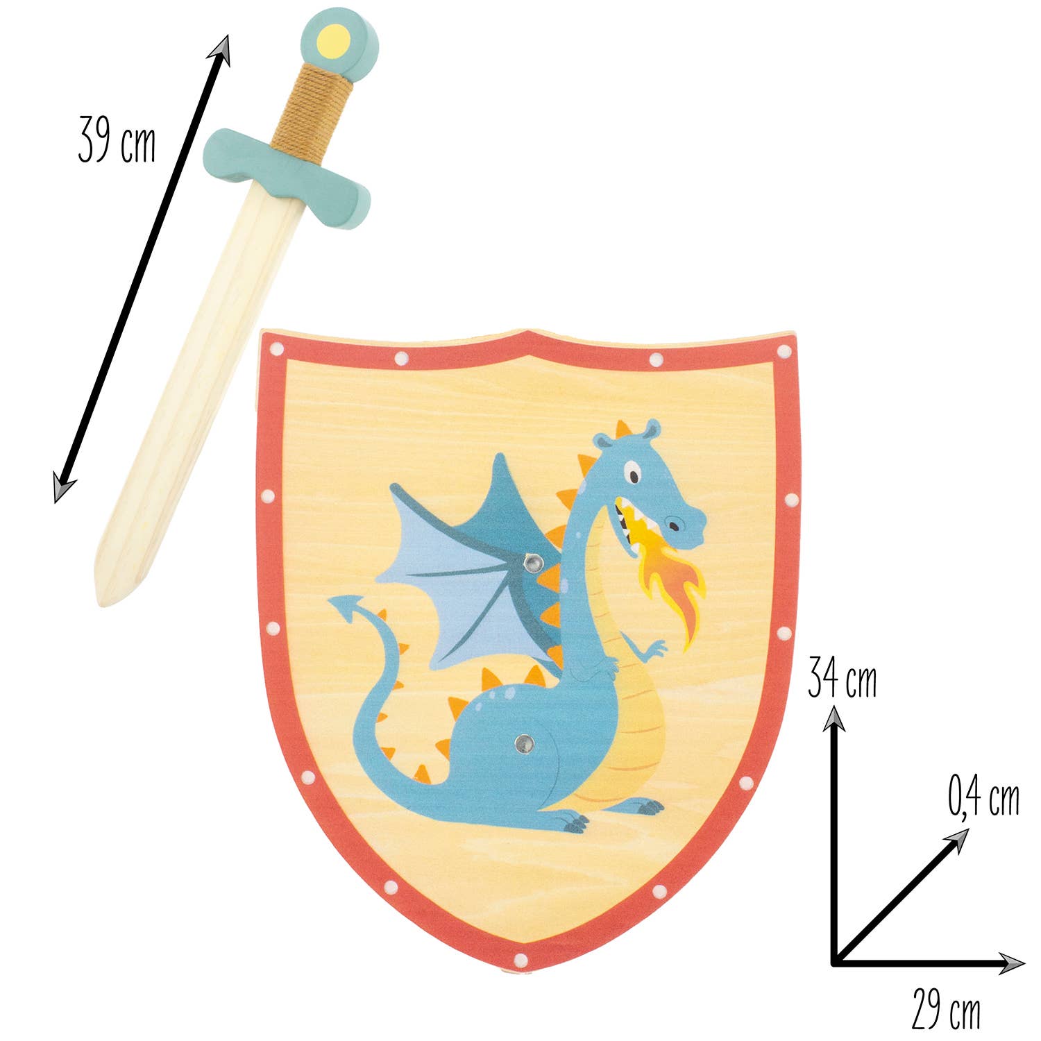 Skölden mäter 34 × 29 cm och är lätt att hålla men tillräckligt stadig för att kännas som “riktig” utrustning. Det 39 cm långa svärdet har ett handtag lindat i rep för ett bekvämt och säkert grepp som passar små händer.