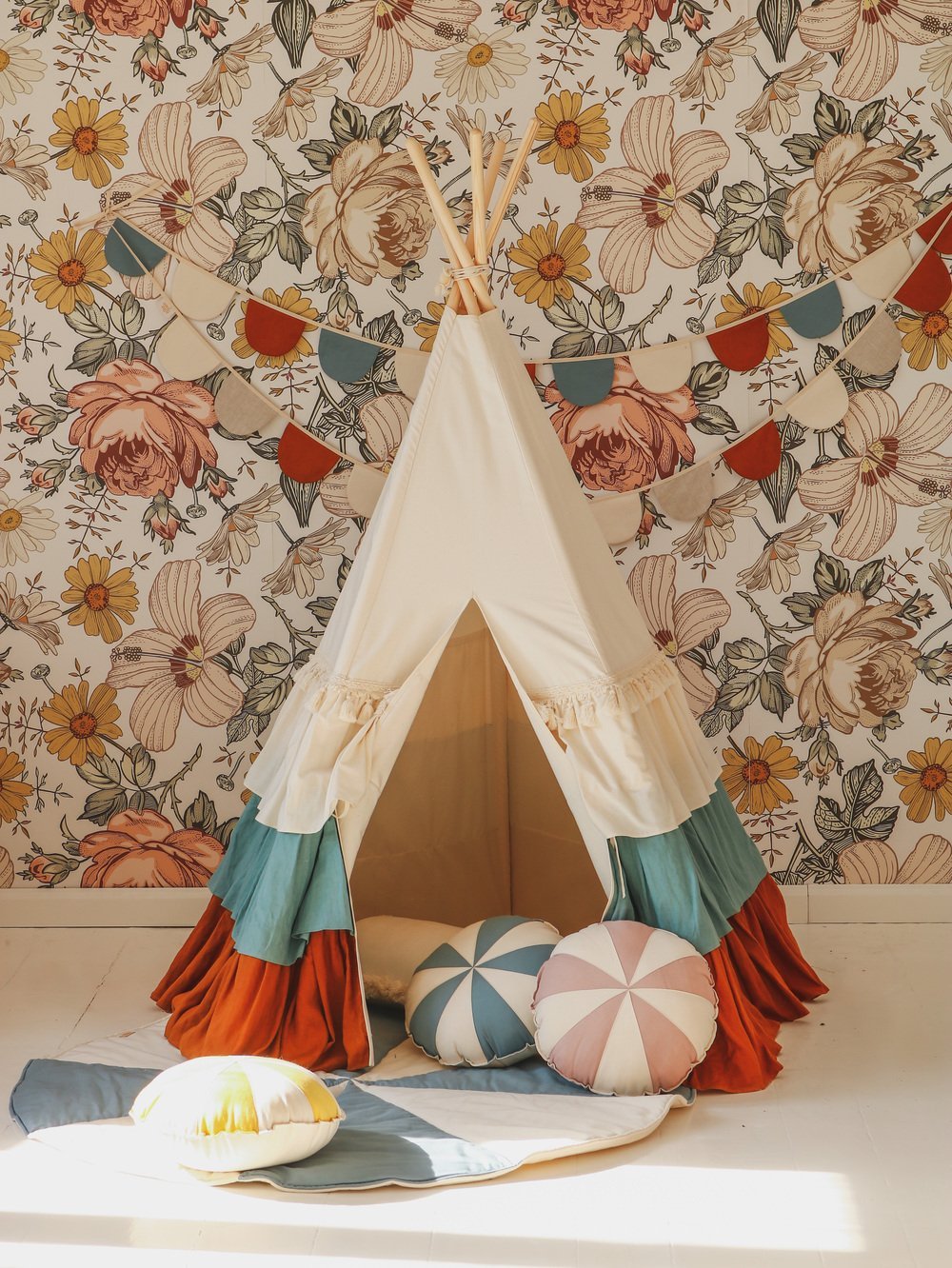 Cirkusmagi i barnrummet. “Cirkus Volanger” är ett tipitält i slitstark bomull med lekfulla volanger och en tidlös cirkuskänsla. Snabb montering, stadiga trästänger och formstark canvas gör tältet perfekt för sagostund, rollekar och myshörna.