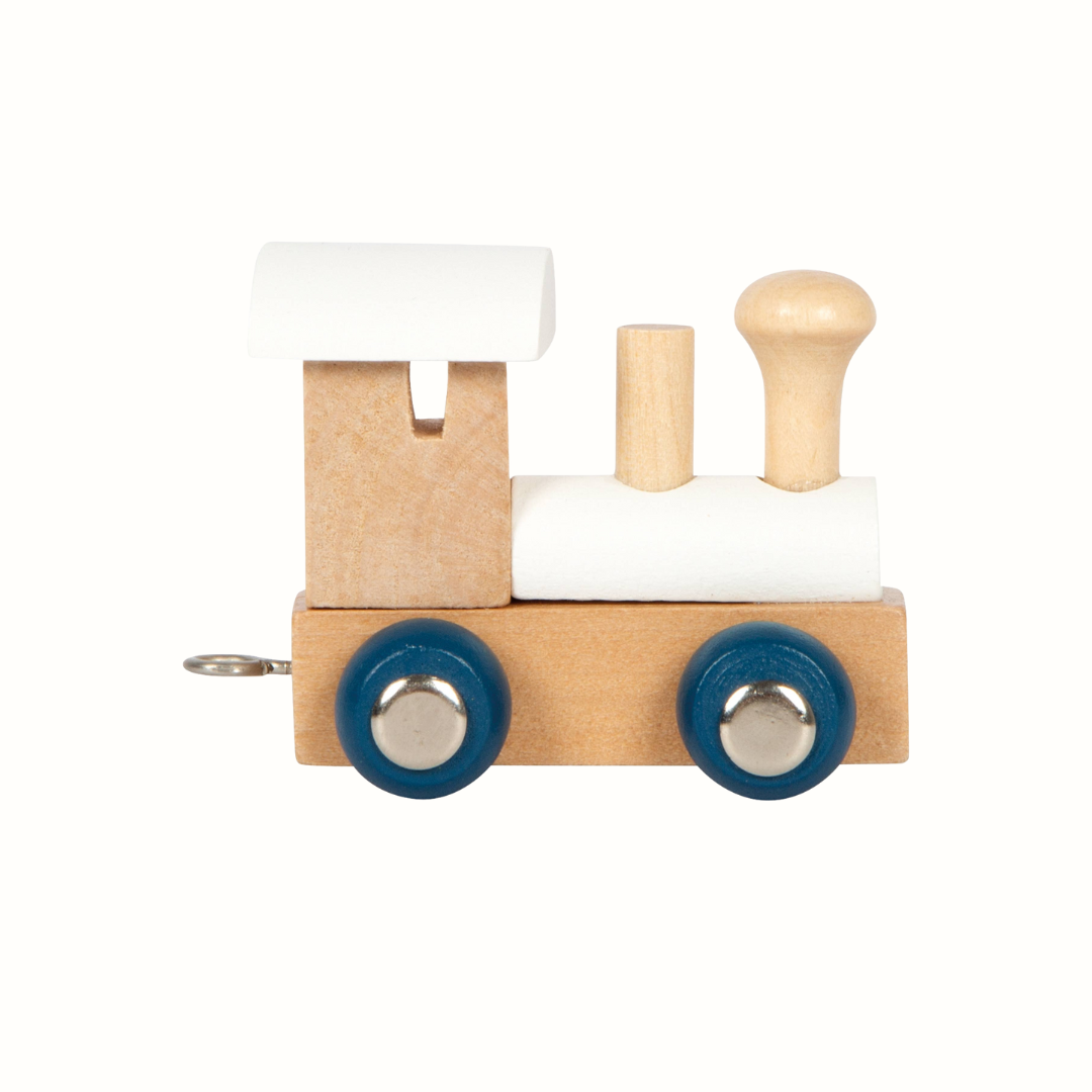 Minimalistiskt trälok i nordiska färger med öglefäste. Fäst egna små “vagnar” med snöre, karbinhake, nyckelring eller silikonloop och låt loket dra små figurer, vimplar eller kort. Hjulen rullar fint på plana ytor. Dekorationsartikel.