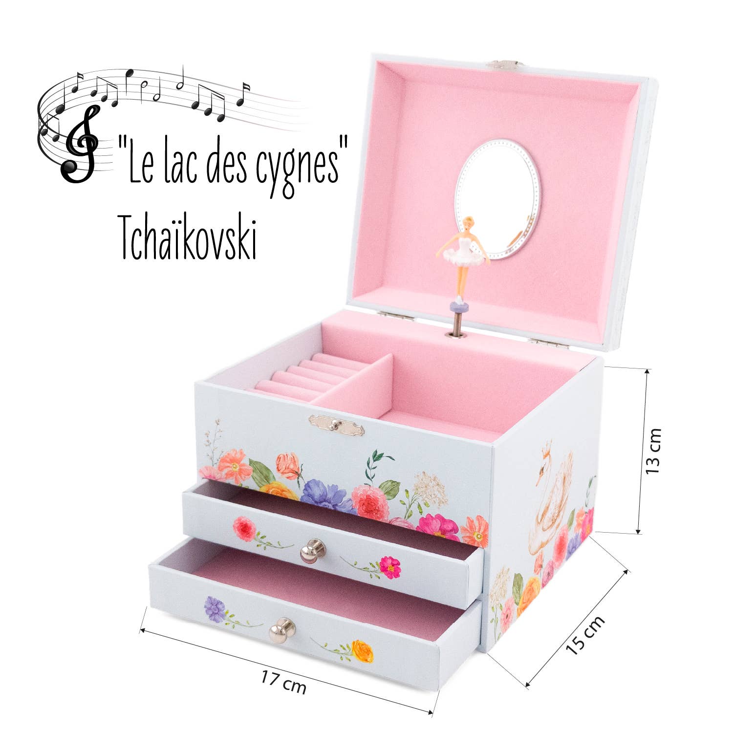 Skrinet har två små lådor och ett ringfack, perfekt för att förvara smycken, små skatter och kära minnen. Inuti locket finns en oval spegel som ger en extra sagolik känsla – precis som i en liten balettscen.