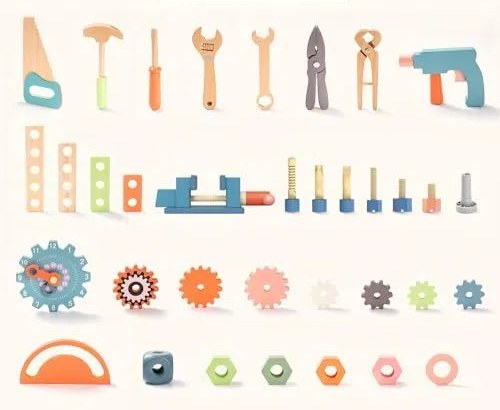 Rejäl verktygsbänk i trä med förvaringshylla, verktygstavla och bänkskruv – komplett med hammare, såg, skiftnycklar, skruvmejsel, linjal samt muttrar/skruvar, kugghjul, hålreglar och en lekborr. Perfekt för Montessori-inspirerad rollek som tränar finmotorik och problemlösning.