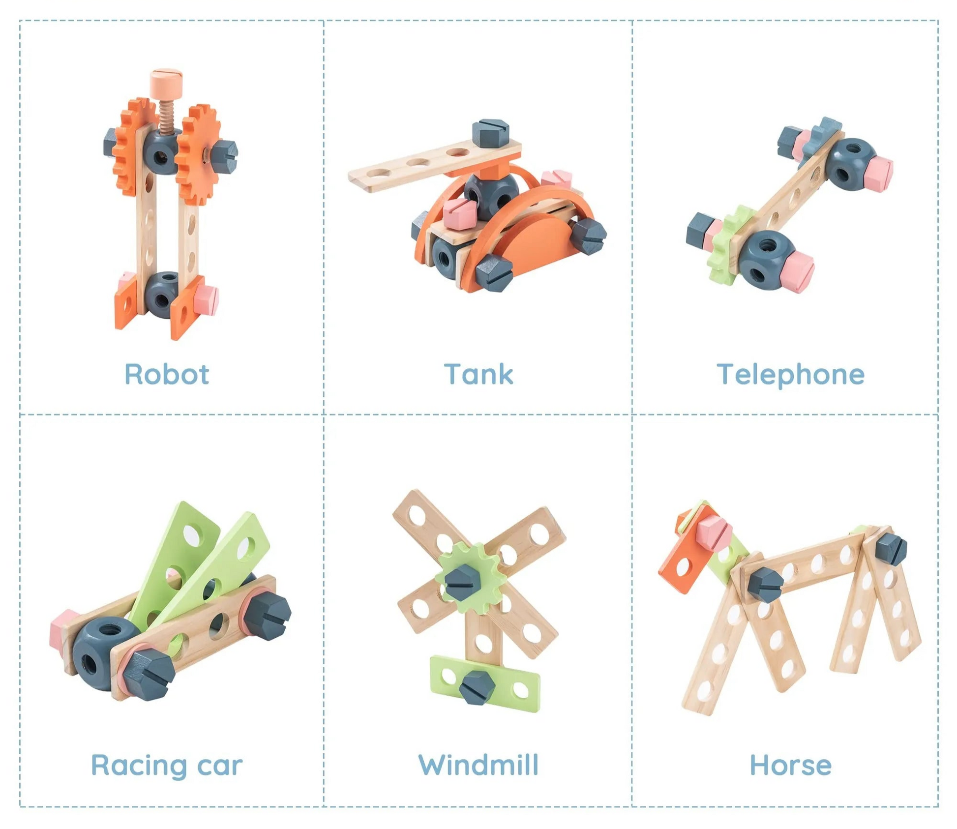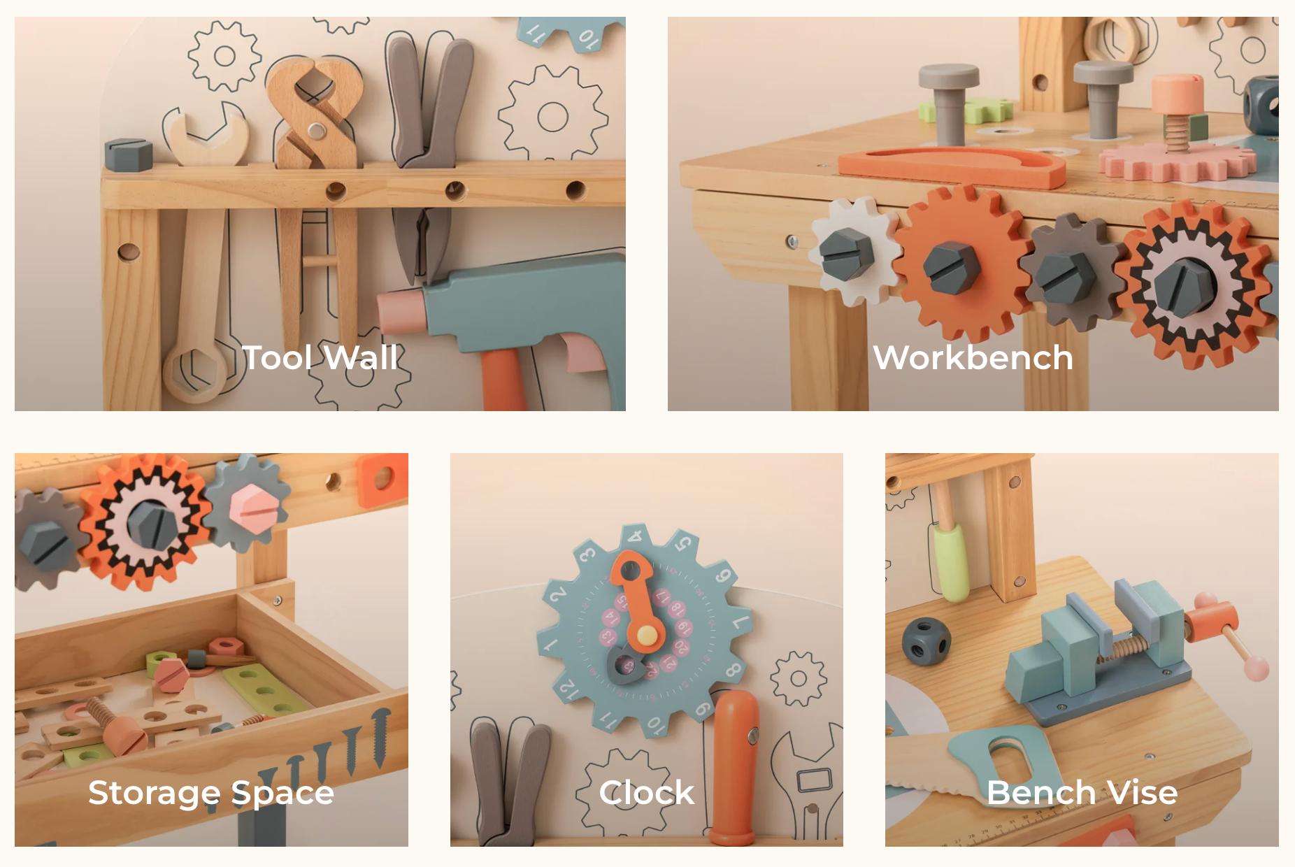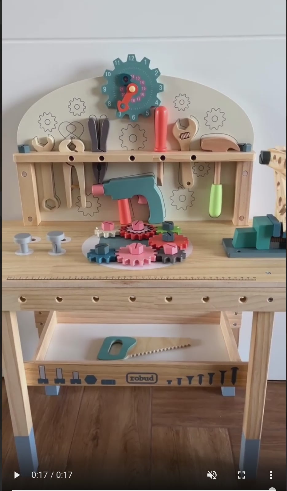 Robuds stora trä-arbetsbänk bjuder in till bygglek som känns på riktigt: häng verktygen på tool wall, skruva i bänkskruven, vrid på kugghjulen och sortera delarna i nedre hyllan. Den öppna designen gör att flera barn kan leka samtidigt och utveckla språk, samarbete och logiskt tänkande. Ytan har förborrade hål för reglar, skruvar och muttrar – klart att börja bygga direkt.